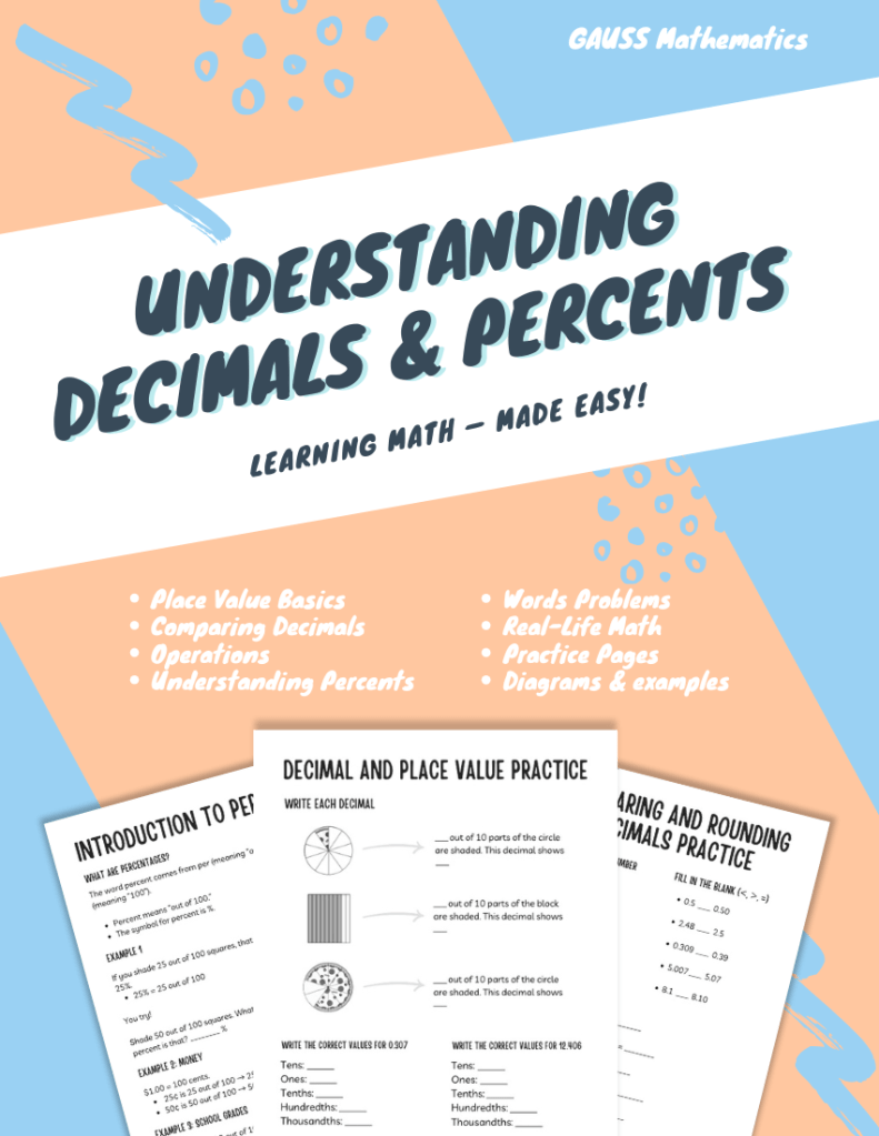 Understanding Decimals & Percents is a friendly, hands-on workbook created to make learning feel clear, real, and achievable for every student. This book is especially designed for visual learners, special needs students, and anyone who’s ever felt lost in math class. Through colorful examples, real-world problems, and simple step-by-step explanations, students learn not just how to solve problems, but why the math works.